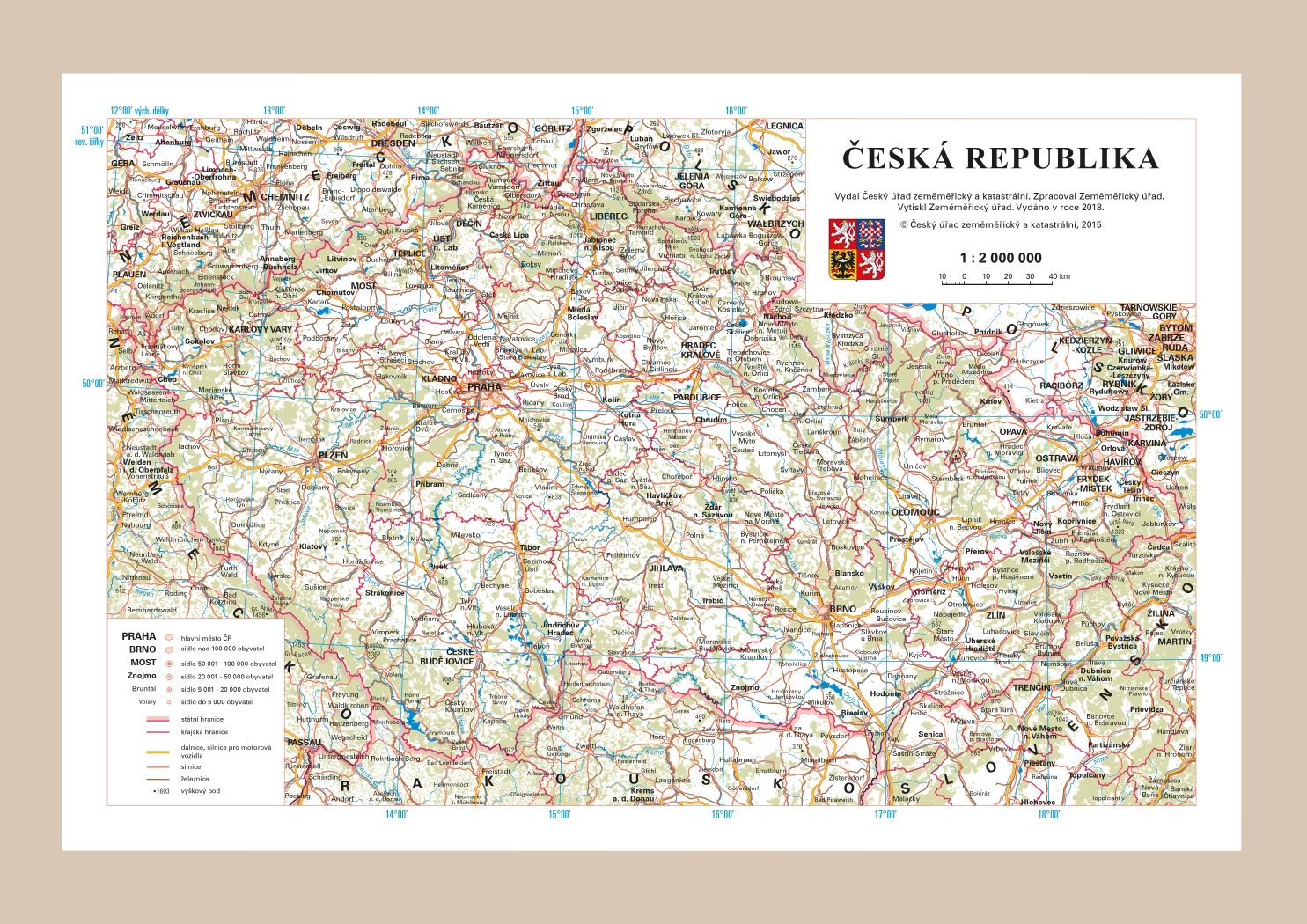 | Product description | The Map of the Czech Republic 1 : 2,000,000 (MČR 2M) relates with the contents of the Map of the Czech Republic 1 : 500,000 and Map of the Czech Republic 1 : 1,000,000. It shows the entire territory of the Czech Republic on a single map sheet. It contains planimetry, altimetry, geographic coordinate grid, map lettering and the map legend. Planimetry consists of settlements, transportation (highways, roads, railways), hydrography (significant water courses and reservoirs), borders (state and regional), vegetation and land surface (forests). Subject of the altimetry are elevation points. Map lettering consists of standard geographic names (names of cities, hydrography), map name and the scale with imprint data and the graphic scale, textual part of the legend and geographic coordinates on the frame edges. The file data are provided in TIFF format and supplemented with TFW files for S-JTSK and ETRS89-TM33N coordinate systems. In addition, the data are also provided in PDF format. | |
