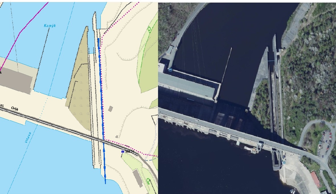 ZABAGED® cartographic representation in the ČÚZK Geoportal – ship elevator, lift is represented by blue line + orthophoto; state to 1/2024; photo: ZÚ archives